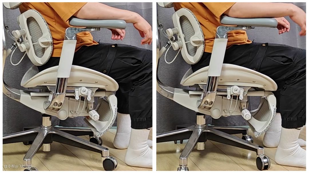 S300坐垫前后调节宽度与Embody也差不多,调节方式是底座旁边的小扳手,轻轻一拉就自动回到最短位置,需要调节坐上去挪动屁股就好,比较简单。