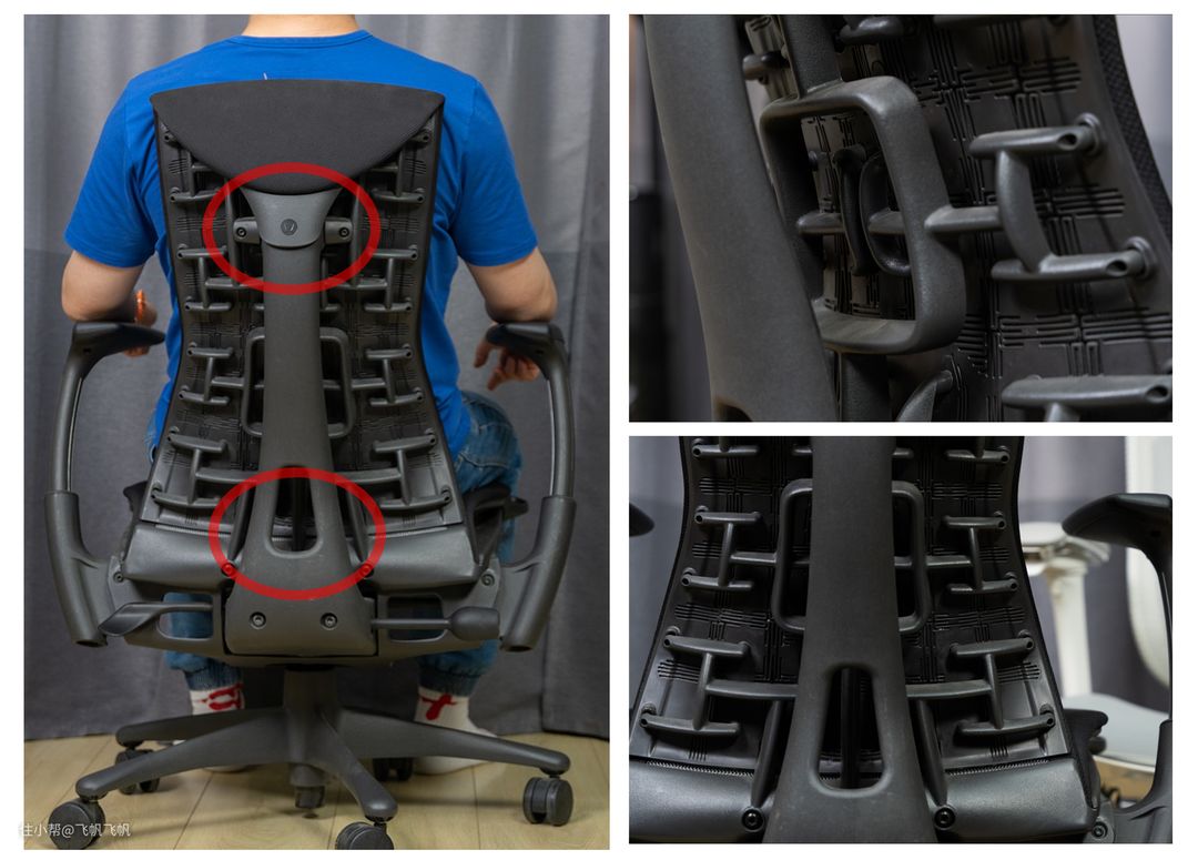 Embody背后点阵式的支撑设计,是采用柱支撑架的顶部与底部,连接左右两边塑料支撑架实现的,工字型的支撑杆一层层传递到中间粗大的主支撑架子上,从而让用户中心脊柱支撑感强烈,左右边缘有较好的支撑但能有一定的活动范围,给人安全的软弹感。