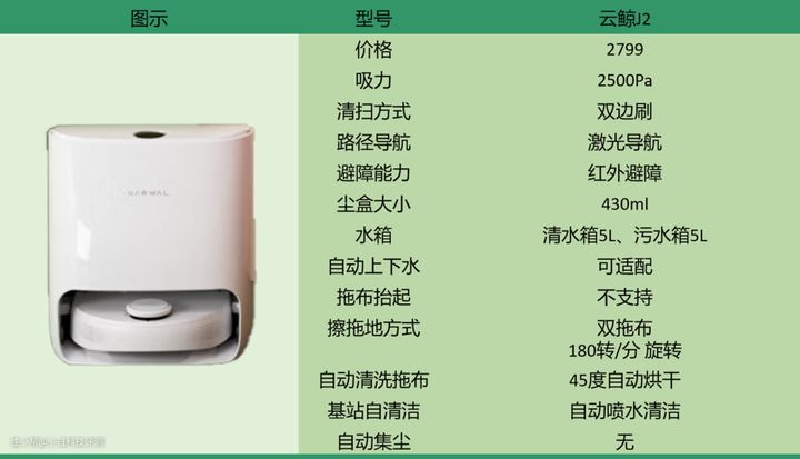 刚出的时候真的非常火爆,属于推动了基站自动上下水+热风烘干的进程,避障采用双沿边传感器+碰撞传感器,也是“碰壁”后建图的一种类型,2500pa的吸力放在当时还是比较强悍了,10N向下压力擦地和180转/分钟的三角拖布;3000左右的扫地机器人入门级别选手,这个价位还是有其他更好的选择,云鲸J2采用了扫地模块和拖地模块手动更换的方式,这算是它的一大弊病。它的扫地、拖地功能只能单一使用,就是扫地的话需要手动更换扫拖模块