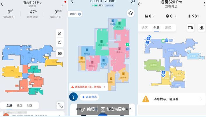 三款机器的建图速度来看的话区别不是很大,科沃斯T20 PRO>追觅S20 Pro>石头G10S,大概都是4-5分钟;更重要看建图的一个精准度!