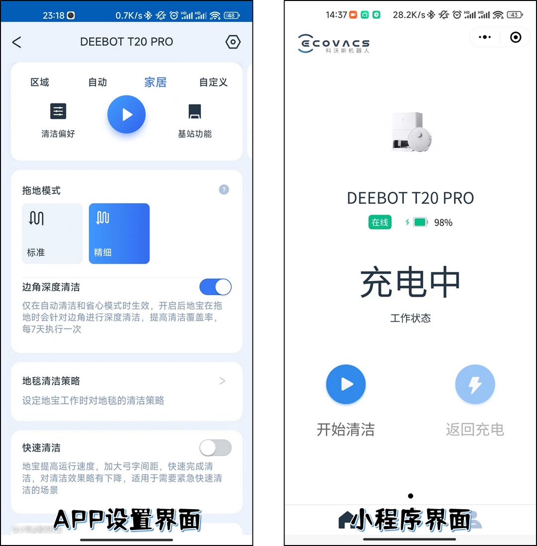 而且科沃斯T20还可以根据家里的干净情况,进行标准模式的拖地或者精细模式拖地。精细模式下拖地,路线的间隔会更小,拖地效果更好,但是也会稍微更耗时一点。