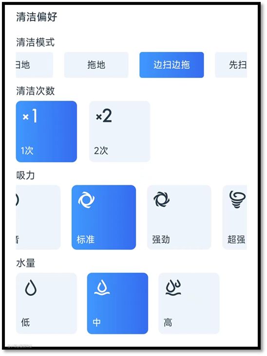 当然,科沃斯T20的可设置的清扫模式还有很多。在毛毯清扫方面,也可以选择避开毛毯,或者无视毛毯进行正常清洁。在全局清洁方面,我们还可以设置单扫,单拖,扫+拖,先扫后拖等多种模式。
