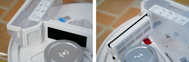 科沃斯T20扫地机的机身内部尘盒在设计时也用了不少的巧思,里面的滤网包括了海绵和HEPA两层,能在充分滤掉灰尘的同时尽量延长HEPA滤网的寿命。