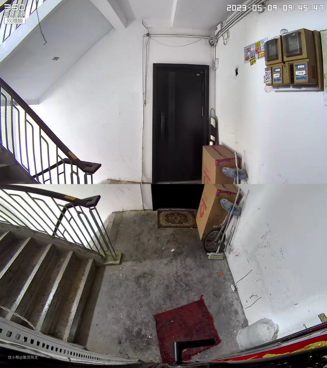 360可视门铃5Max室外机的主摄像头为400万像素,可视广角为水平127°,垂直70°。辅助摄像头则是100万像素,可视广角为水平132°,垂直72°。通过主摄像头和辅助摄像头的配合使用,整体的拍摄角度特别大,视野范围从地面到楼道顶都能拍到,后续阵主也会演示它的效果~