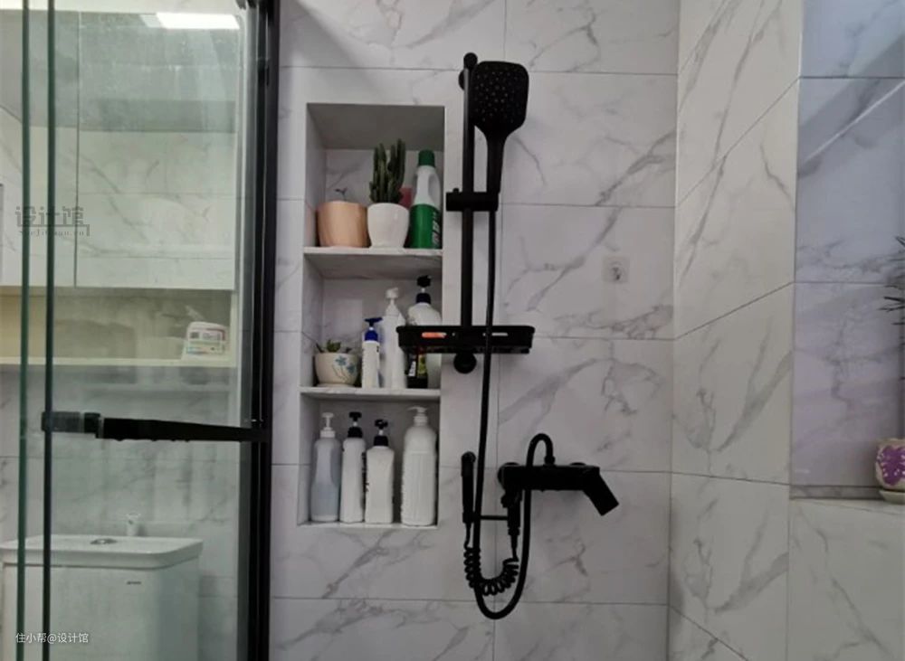 而在封下水管的时候,连着封下水管的墙面做个壁龛的话,就能把淋浴房里面的尖角去掉,让淋浴房更加安全舒心。