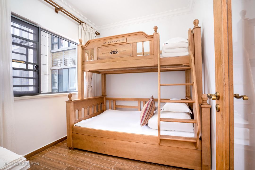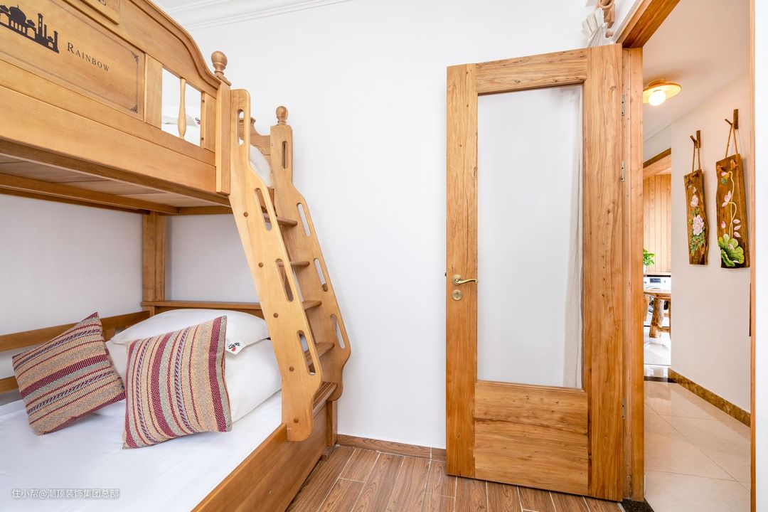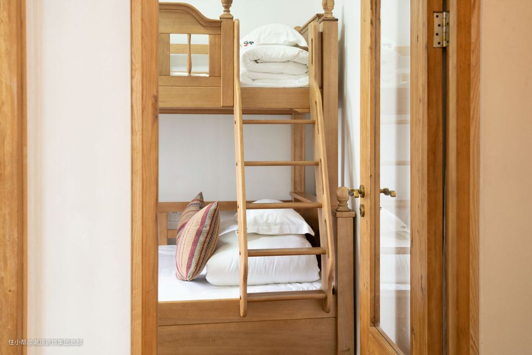 最小的房间做的是一个高低床的形式,想到女业主平时虽然是一个人居住,但是偶尔家里面还是会有亲朋好友来暂住一下的,所以客房就用的是最节约空间的高低床来展示,刚好高低床的床体颜色原木风格跟整体的感觉也搭配的上。 #次卧#高低床