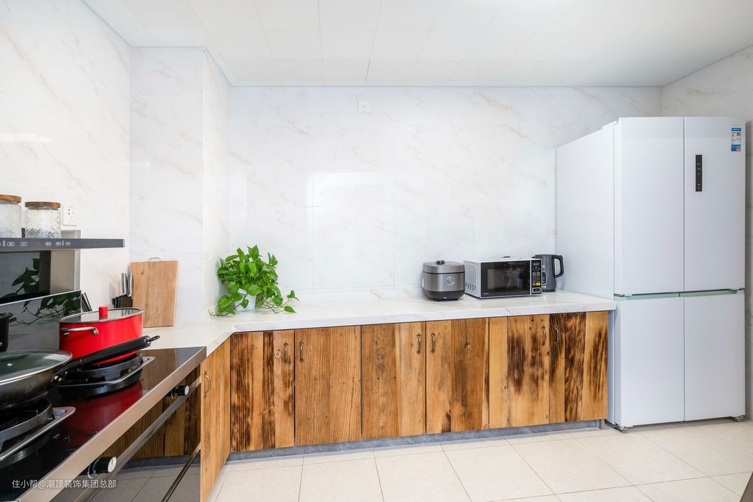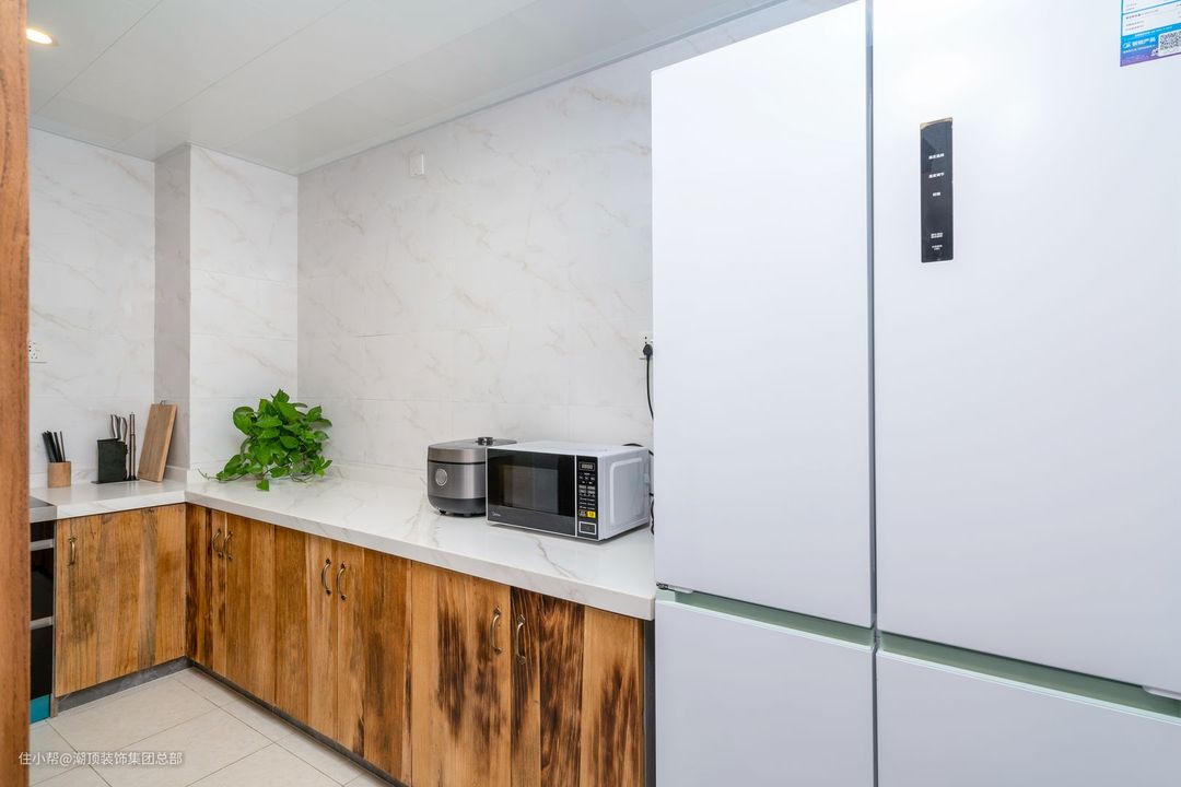 为了防止视觉上的杂乱,除了柜体和墙面色调统一外,冰箱还特意做成全嵌入式,柜门作为冰箱门使用,满足使用功能又和谐 ,整体柜体也是采用的一个原木色调来统一全屋的风格。 #厨房#橱柜