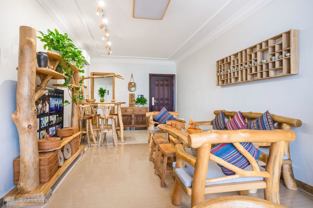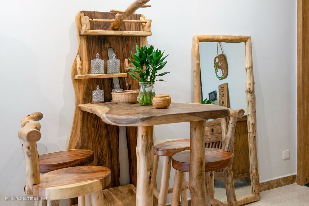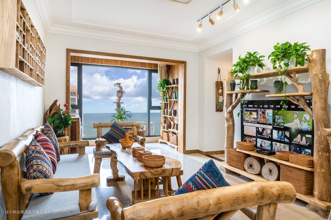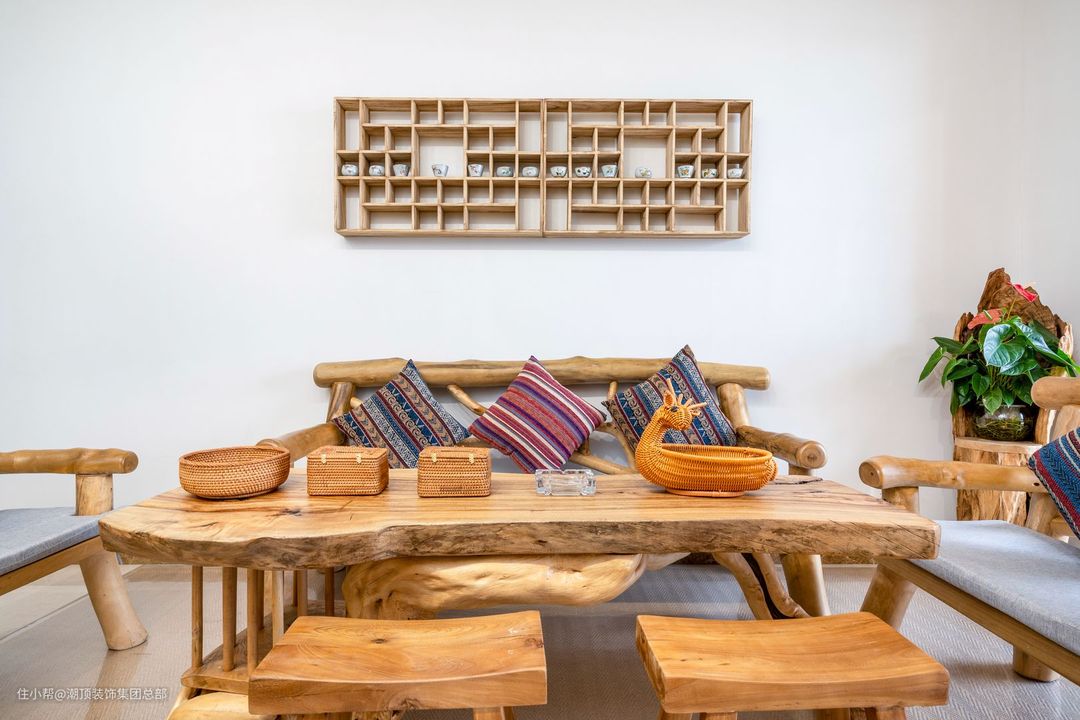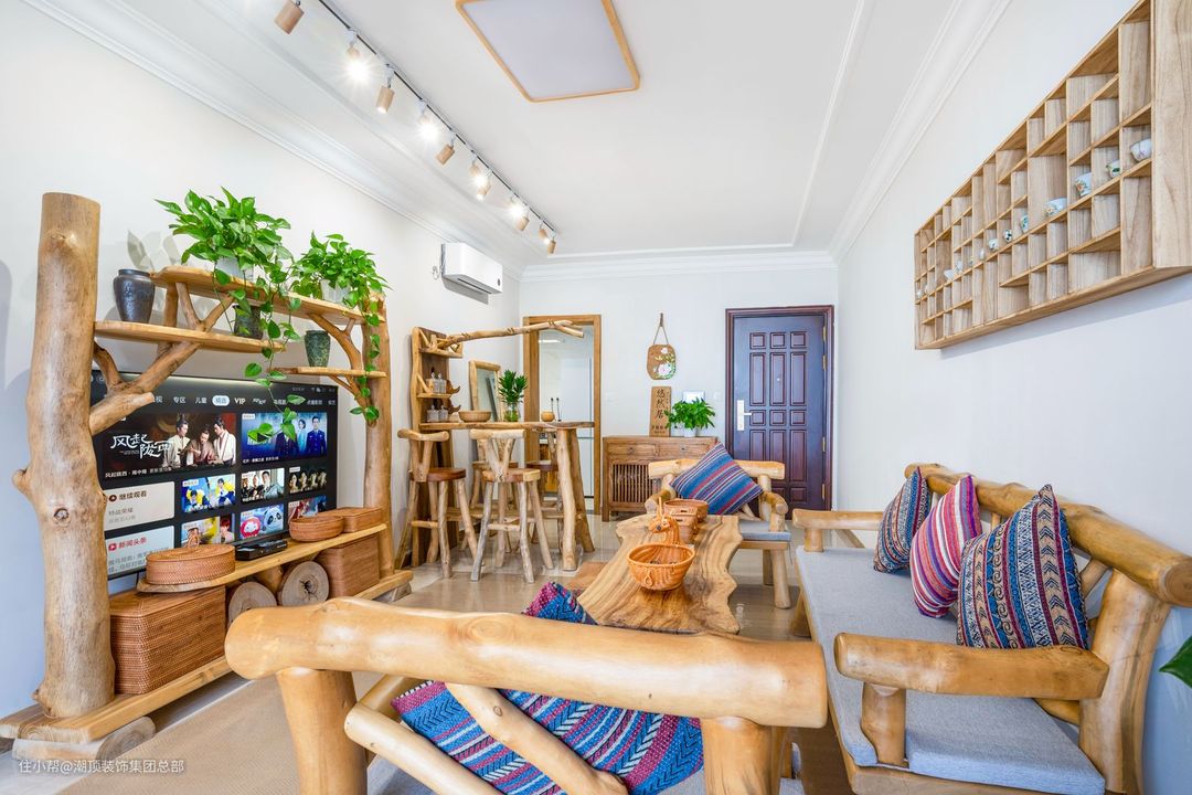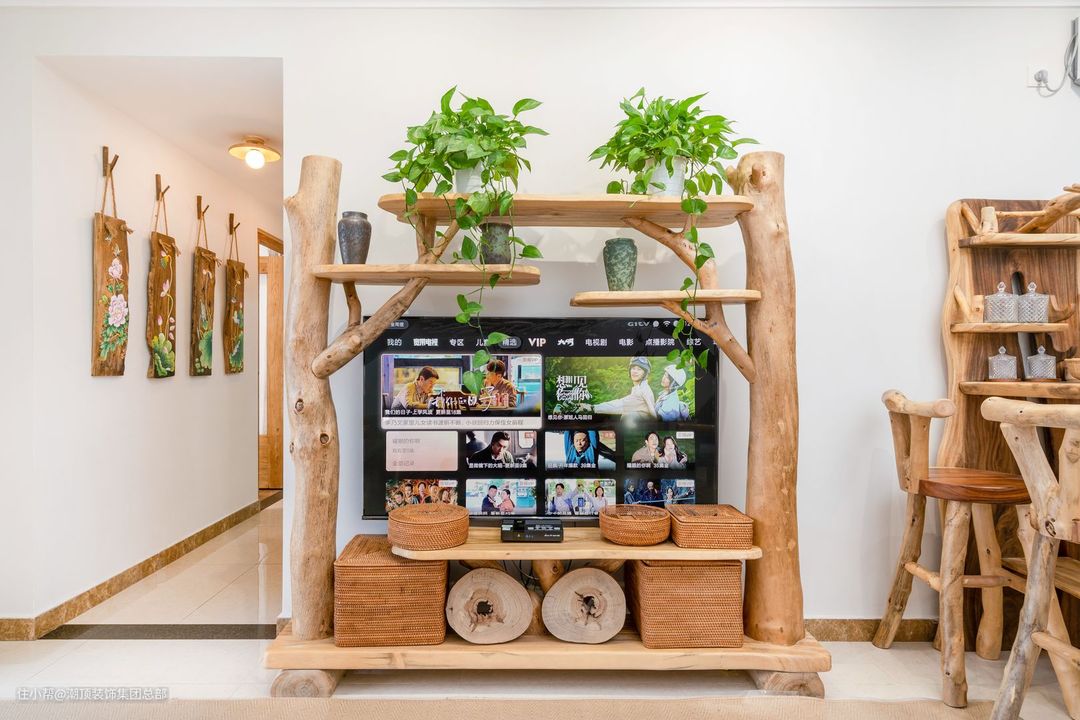 整个家的气质贯穿着我们女业主喜欢的原木主题。 没有吊顶只安装了射灯,无踢脚线,无棱角,墙面、天花、地板色调统一,刷上微水泥自然质感,裸露细腻,在不同的灯光下呈现出不一样的原生态与质朴之美!搭配上原色调原木的家具,以及独有民族风情的装饰,巧妙运用设计绿植搭配,整个空间特别又高级! #客厅#餐厅#餐边柜#电视柜