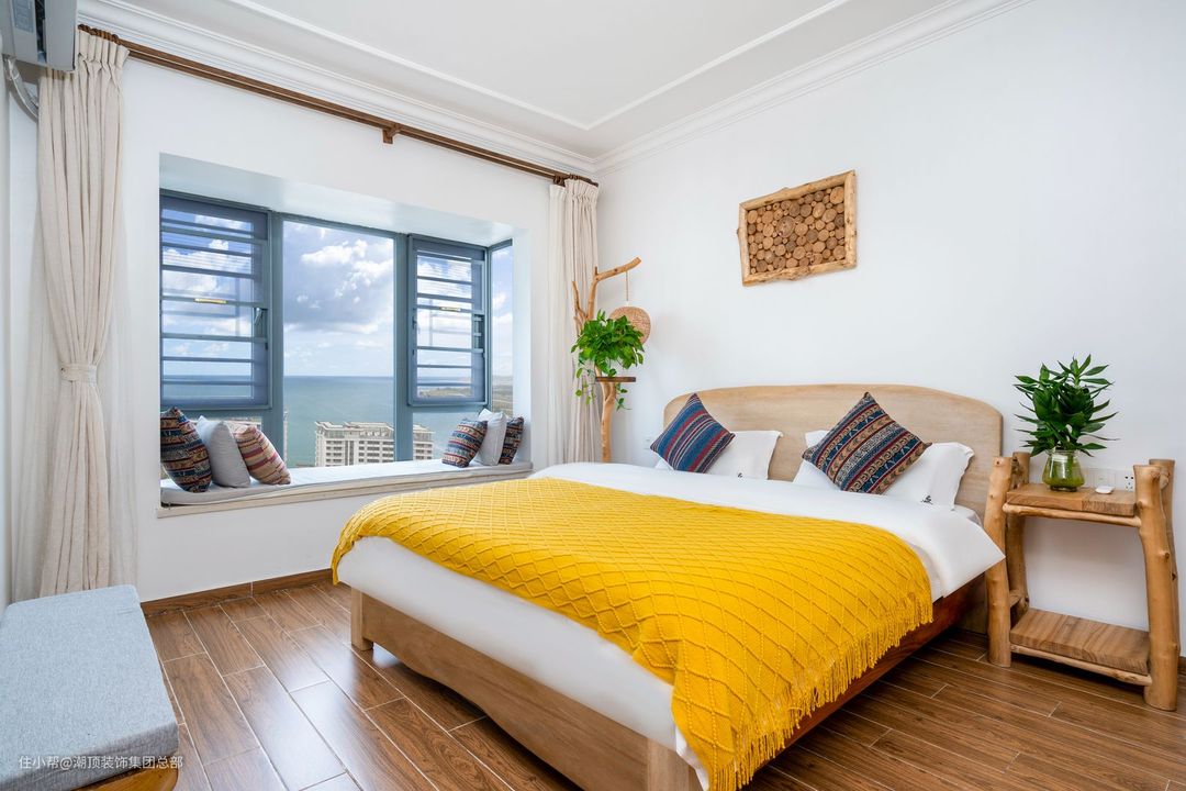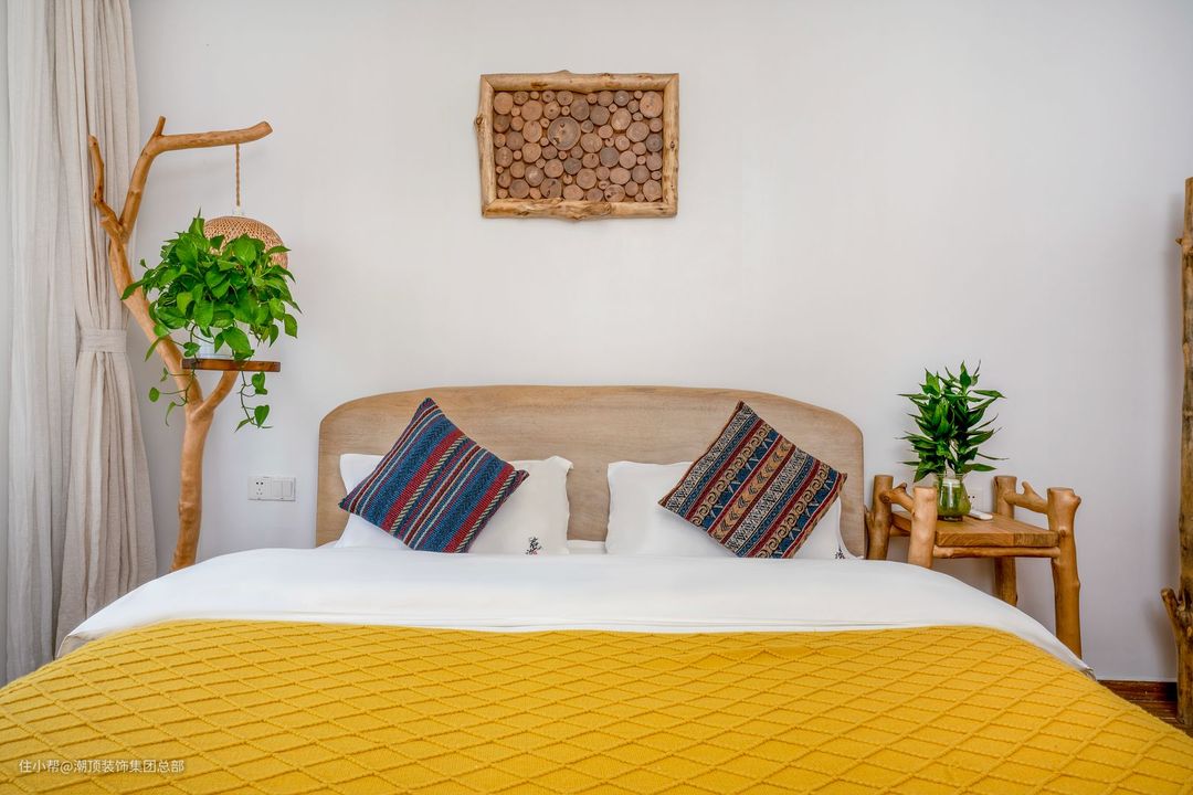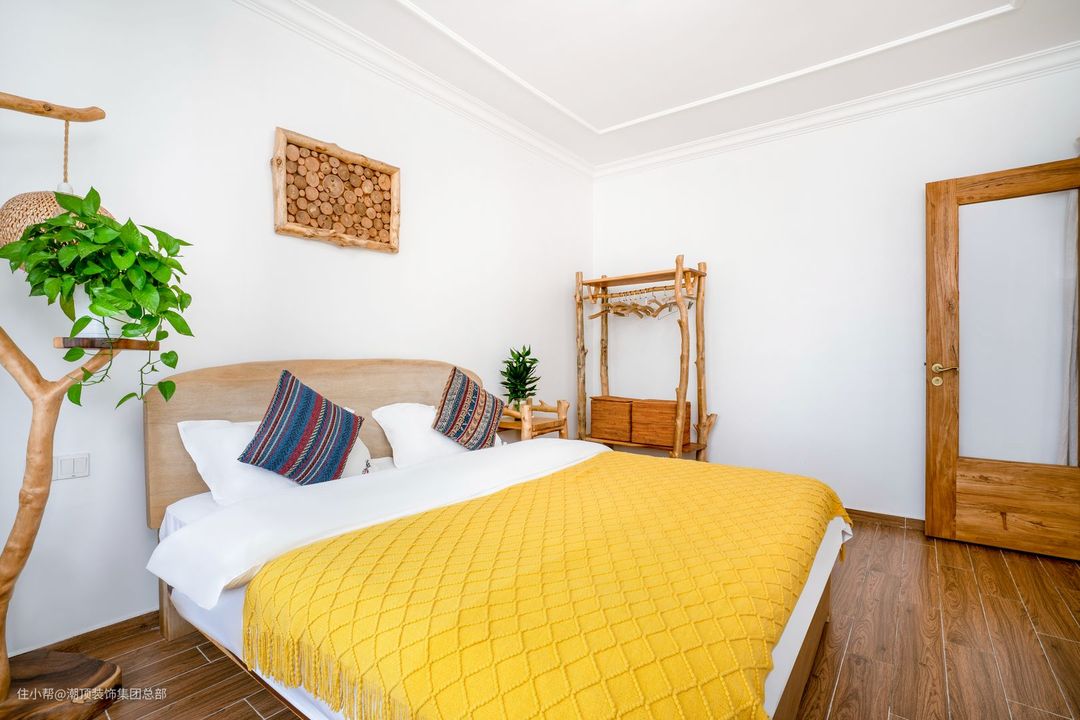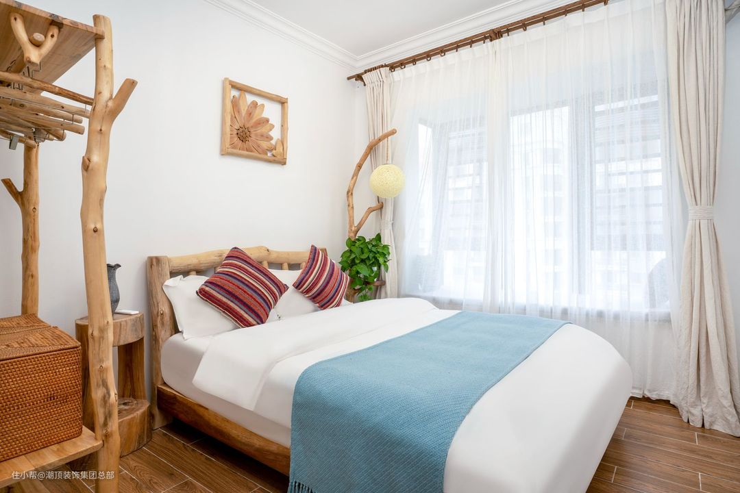 次卧的布置跟主卧差不多风格,只是搭配的是浅蓝色+民族风格的抱枕,以及白色慢布的窗帘。 #卧室#床头柜#床
