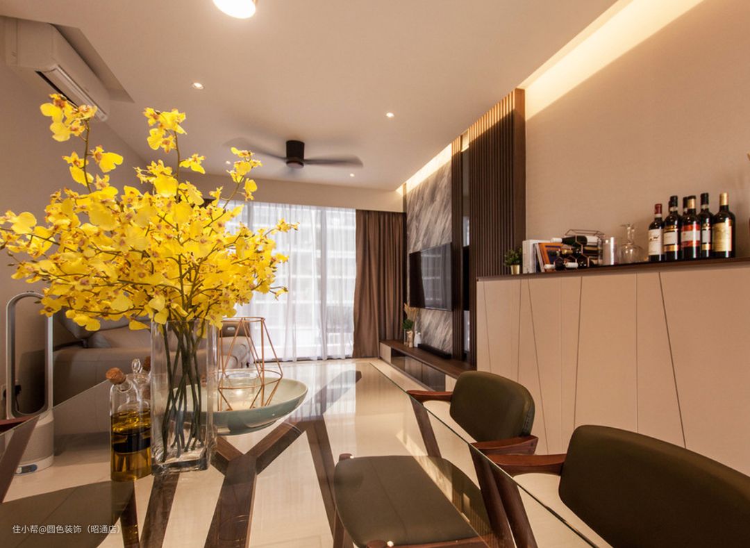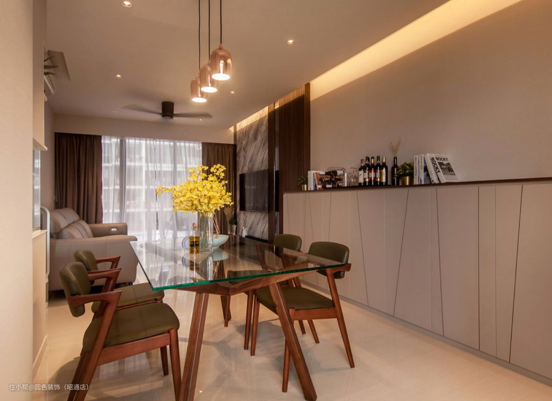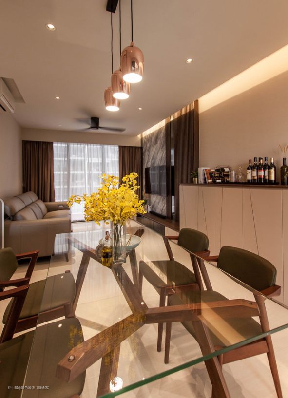 此外,餐桌的透明玻璃面板在视觉上非常透亮,让整个家居空间更显开阔和明亮。同时透明的物质易于清洁,提高了使用效率和卫生性。通过实木餐椅进行搭配,更加凸显出整张餐桌的高贵气息,增加了整个室内区域的时尚感和美感。