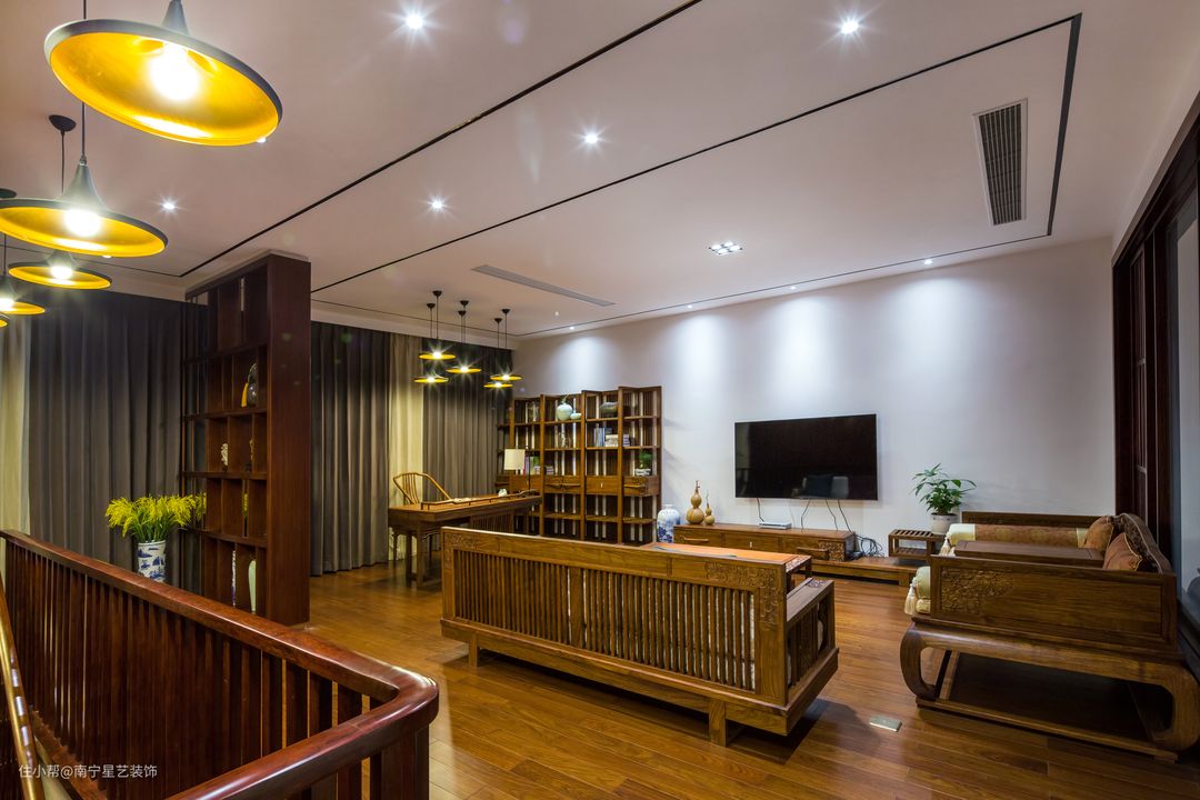 二楼起居室是一个会客、洽谈和办公的理想空间,同时也是家中的休闲娱乐场所。整个空间的装修风格和红木家具相得益彰,配上博古架装饰古玩,呈现出一种新中式的文化气息。