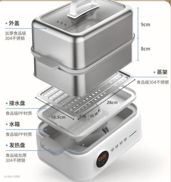 - 电蒸锅自动预约、计时、保温功能,加水提醒,防干烧断电保护功能,安全感足