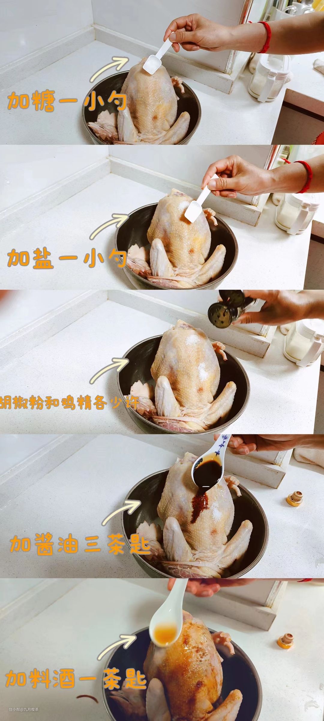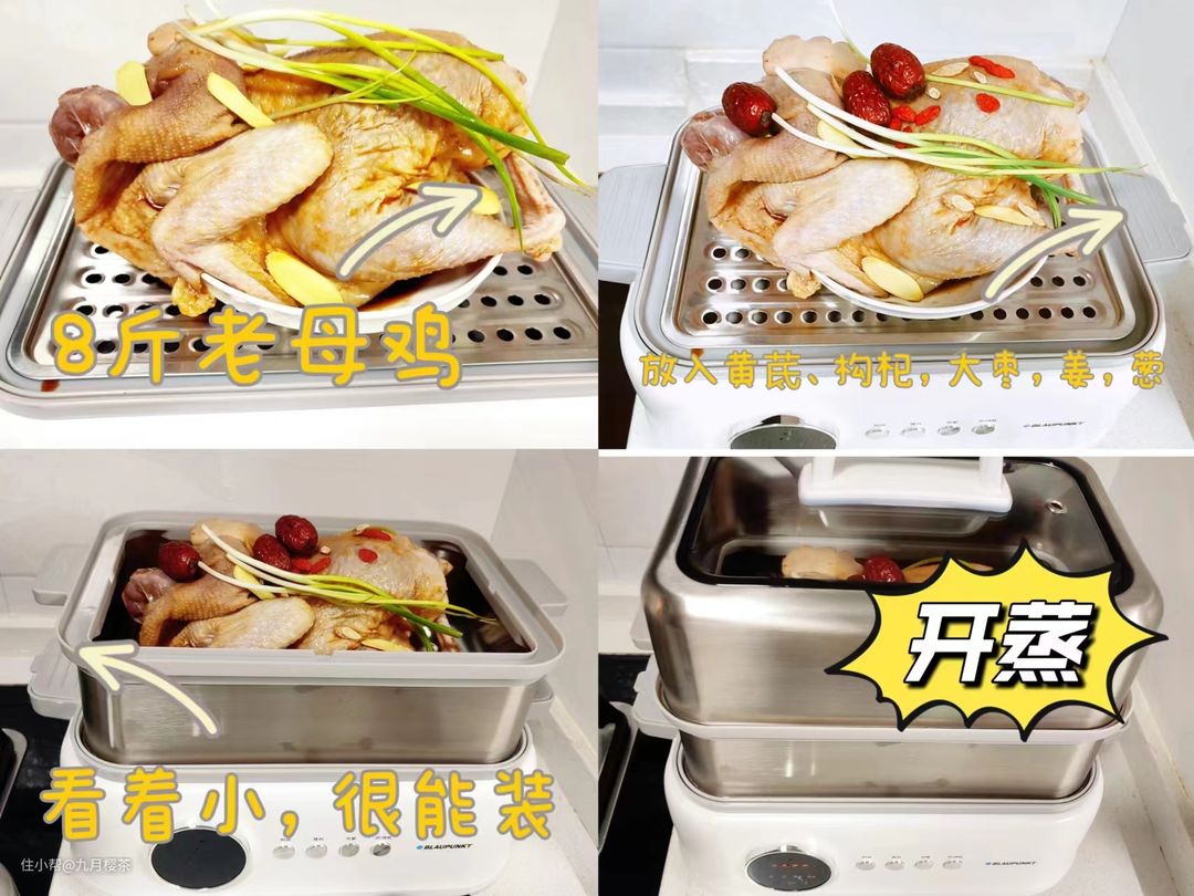 先把老母鸡用各种调料腌制,再上锅蒸。