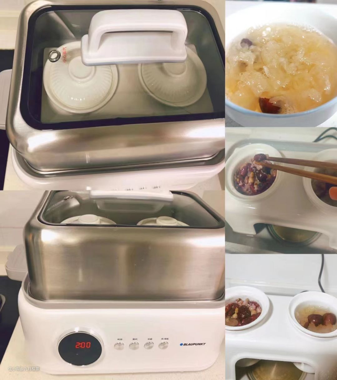 附送的炖盅有两个,都是0.5升的,可以炖汤,炖甜品,二个加起来正好够一家四口吃完,非常实用了。看我煮的银耳汤和杂粮粥各一盅,口感非常好。