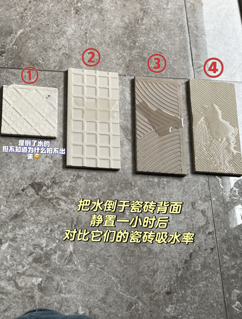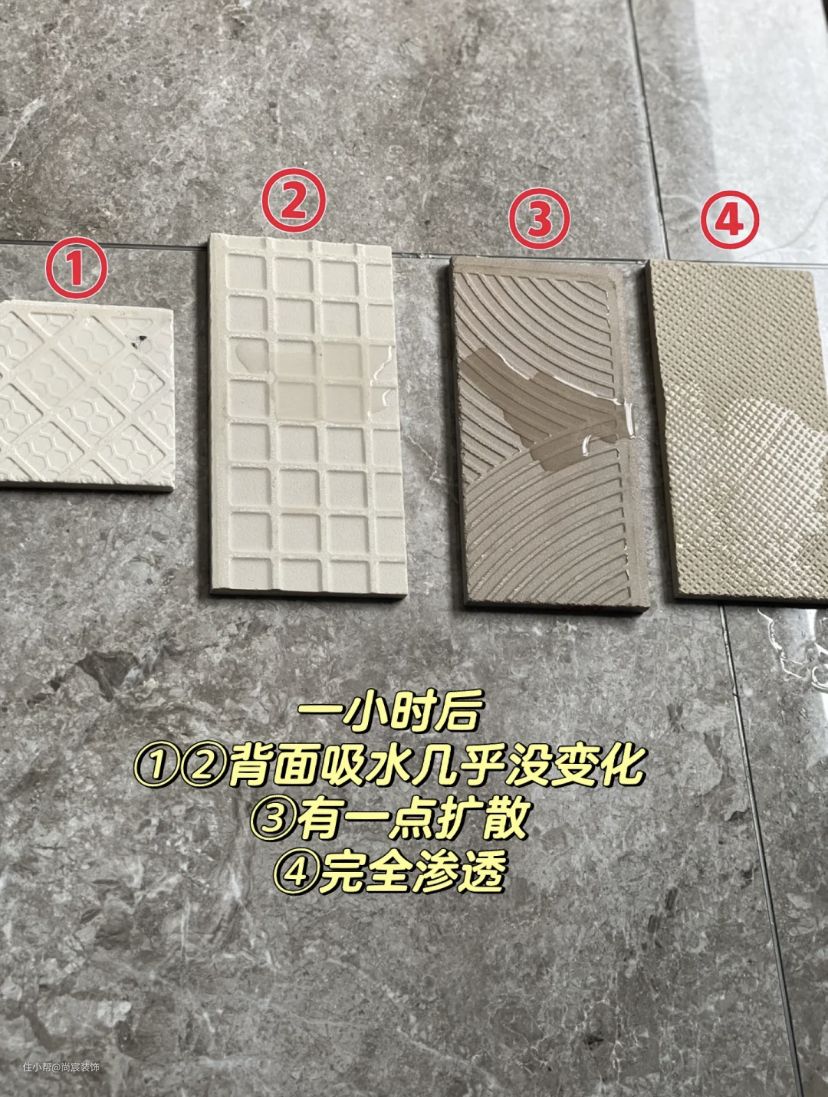 ⑤滴水试验。可将水滴在瓷砖背面,看水散开后浸润的快慢,一般来说,吸水越慢,说明该瓷砖密度越大;反之,吸水越快,说明密度稀疏,其内在品质以前者为优。(试验不能以表面涂抹来衡量,表面光滑不吸水很可能就是表面防污剂和蜡比较多,那样的砖不吸水,会很滑,不安全)。