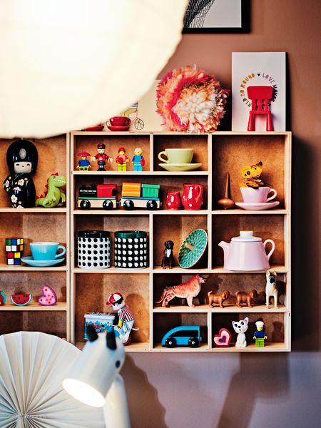只需一块展示隔板,就能给袖珍茶具、汽车火车、动物朋友们在墙上安一个”家”。大大小小的格子应该摆些什么?交给孩子自己布置吧!