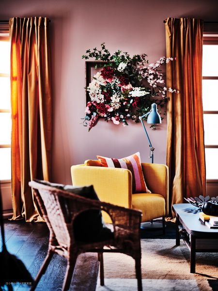 一把满满自然清新的手工藤椅,一把明黄色的现代风格扶手椅,两种风格的大胆混搭,让沉闷的客厅变得活泼又有趣!