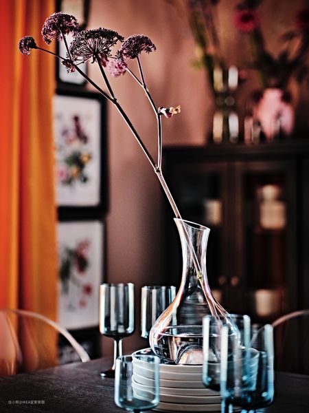雾蓝色高脚杯,像光洁的艺术品般亭亭立在餐桌上;曲线优雅的醒酒器,则是水中脖颈修长的白天鹅。