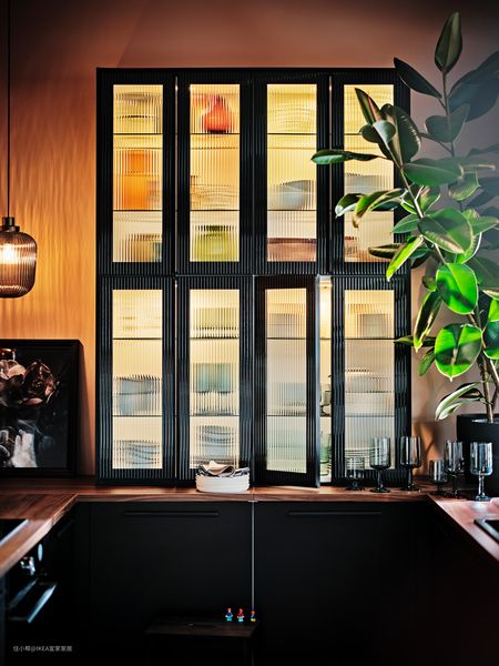复古条纹玻璃,像是给柜子里的餐具打上了一层马赛克,呈现出若隐若现的美感!黑色铝框包边简约又高级,并且耐脏易清洁。