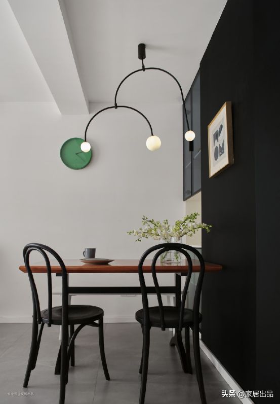 餐厅利用被分割了一小部分给卫生间后的凹陷做了餐边柜,增加了储物空间,和客厅之间没有做明显的区域分割,软装克制又新颖,木色餐桌搭配与背景墙几乎融为一体的黑色餐椅,有一种独具一格的魅力。
