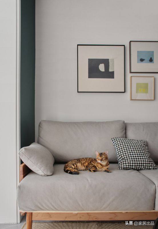 木质沙发搭配灰色布艺坐垫,与沙发同色系的地毯让客厅的层次得到丰富,三幅不同规格的艺术画作为修饰沙发背景的点缀,适当留白让空间更随性舒适。
