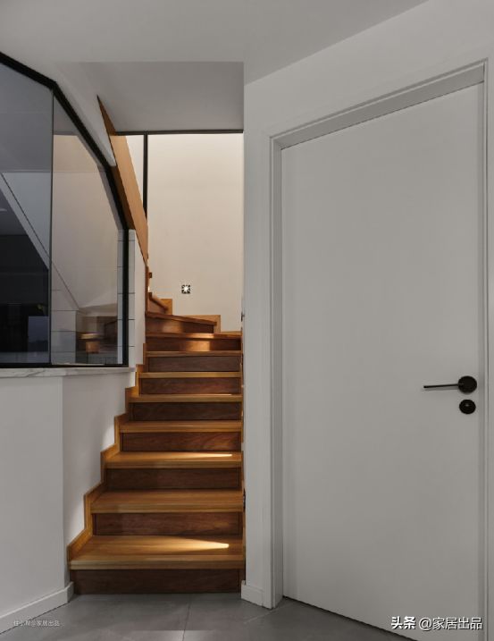 楼梯两边都是斜切角,极大地增加了此过道的空间流畅感。每个踏步的下面也是储物抽屉,里面可以放换季的鞋子。侧面墙壁的人体感应灯趣味性十足,方便老人起夜。