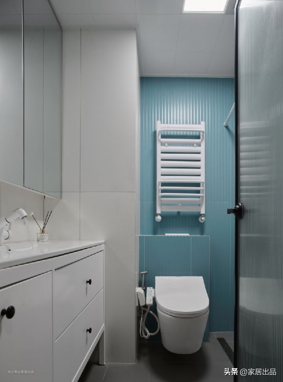 卫生间比较小,洗手池借用一部分餐厅的空间,考虑到父母用这个卫生间比较多,淋浴房做的无挡水设计,浴帘+加长地漏足以挡住大部分水汽浸入干区,无障碍化处理,使用更安全。