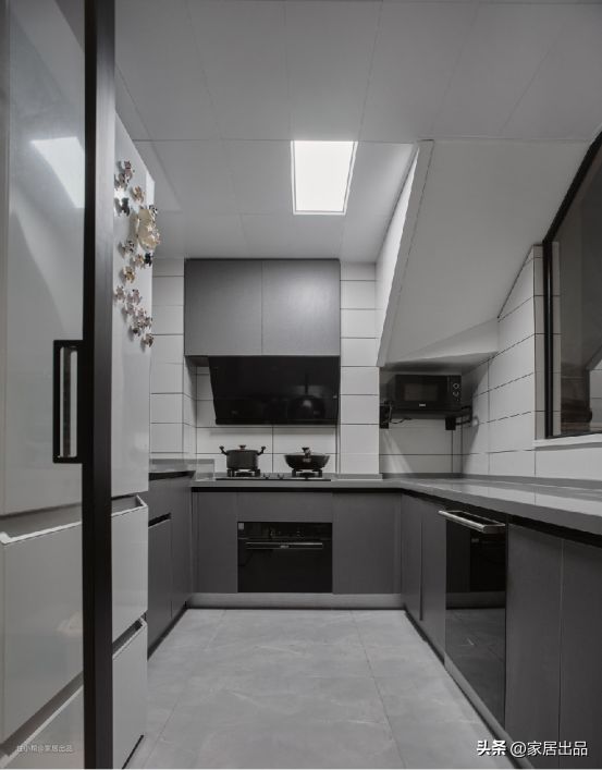 打开厨房,但夫妻俩又不要开放式的厨房,所以把厨房和楼梯之间的隔墙改为半截玻璃隔断和玻璃移门,这样厨房、楼梯和餐客厅之间就有了关联,而不是各自独立的空间。