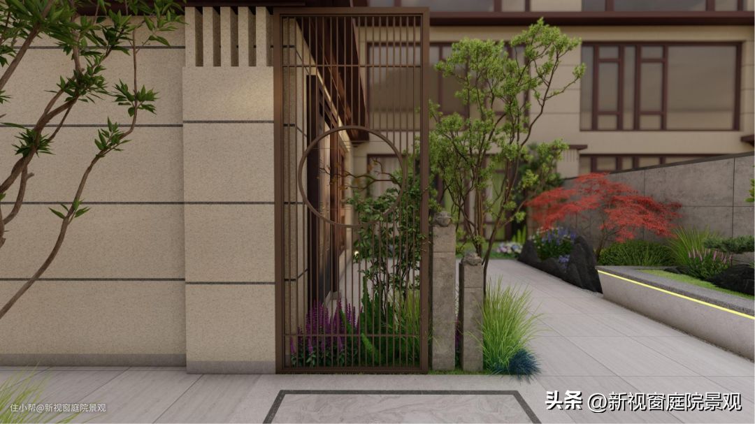 院子呈现出明确划分的“L”型整体布局,其入户门与室内入户门错开,同时还贴心地设计了新中式栅栏,为整个院子增添了浓郁的文化气息。门口设有精心设计的植物景观,室内外的绿植种植丰富多样,营造出浓郁的自然氛围。整个景观设计以外围为基础,注重细节,设计精巧,使得整个院子更加优美、和谐。