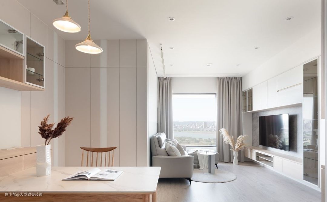拥有美丽江景的90㎡北欧风小宅,为了彰显天生的景观优势,烘托户外的自然气息,整体没有使用过多的设计手段,选择浅淡的纯白和燕麦色调衬底,打造无负担的视觉画面,并利用圆弧造型带入跳色元素,塑造充满活泼气息的治愈系画面。