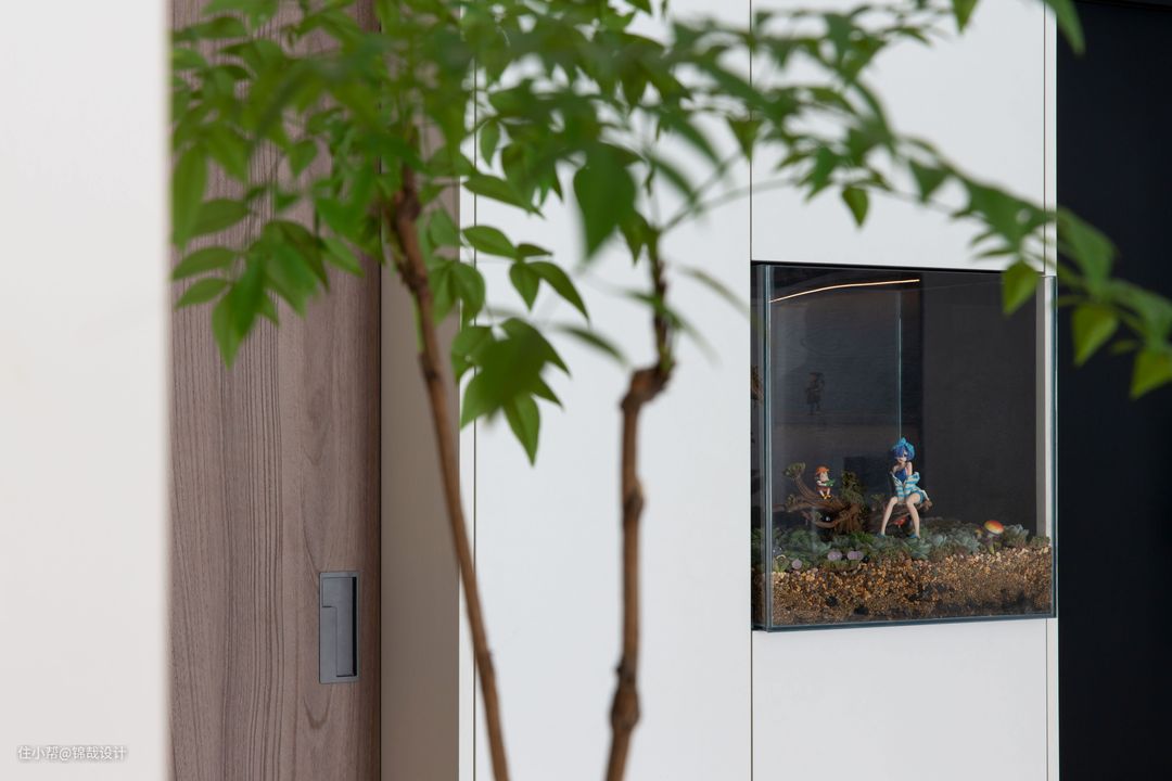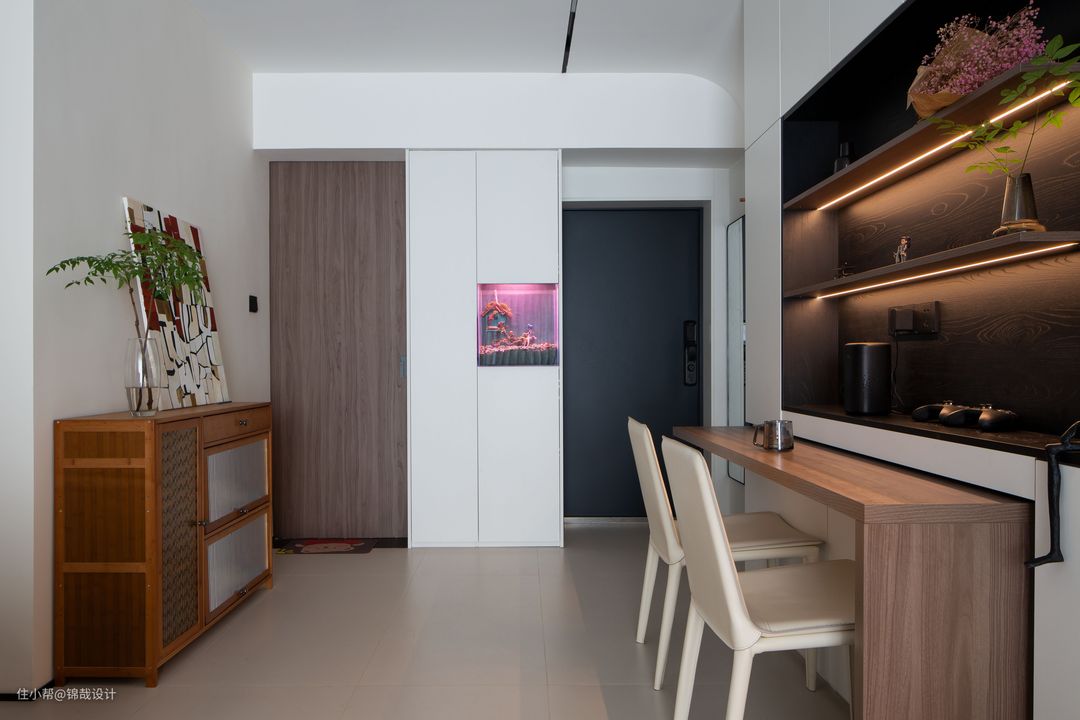 设计亮点:利用原有鞋柜的空间,将女主的多肉植物做成了入户区域的一道景观,雨林缸的出现给入户添加了几分生机和趣味!