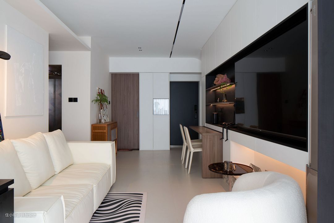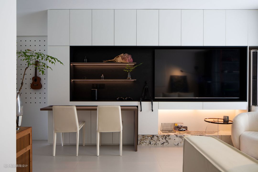 设计亮点:为了让业主有更好的观影体验和享受智能的产品,客厅选择了一款海尔75英寸的智能电视机。整个电视墙面以白色的面板作为柜门,黑色作为电视墙空间的延续,这样会让空间显得更加的简洁、大气。