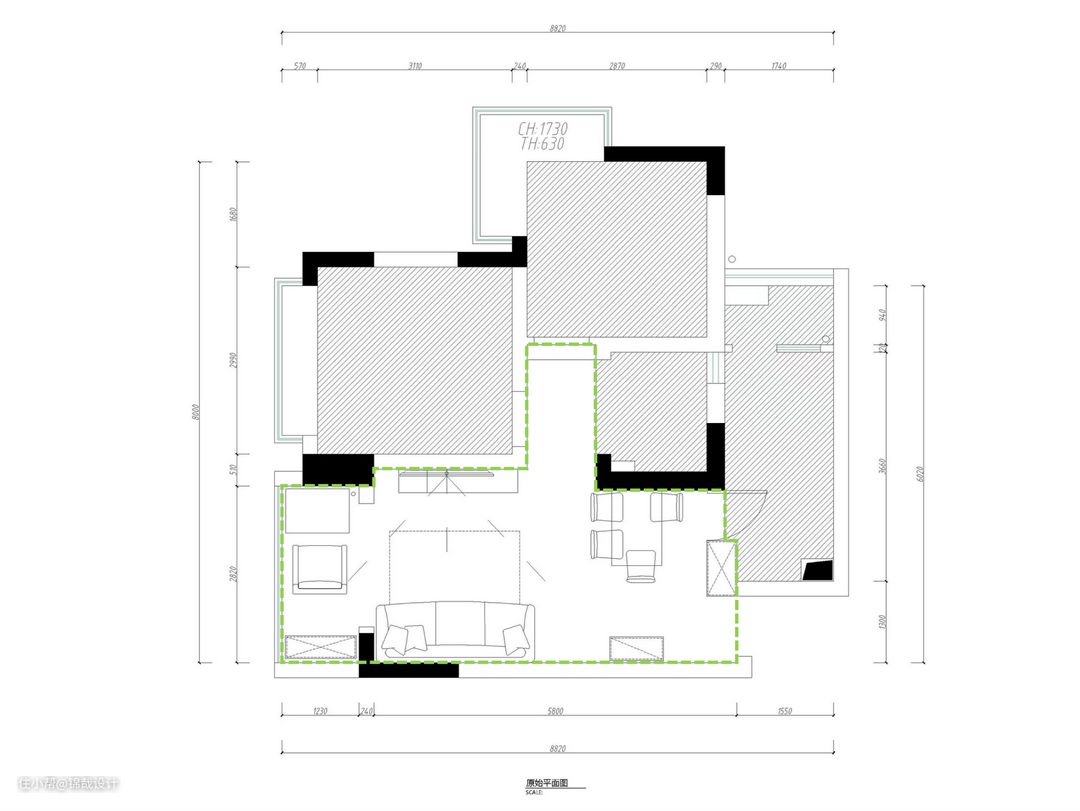 改造前平面图【绿色虚线为改造区域】