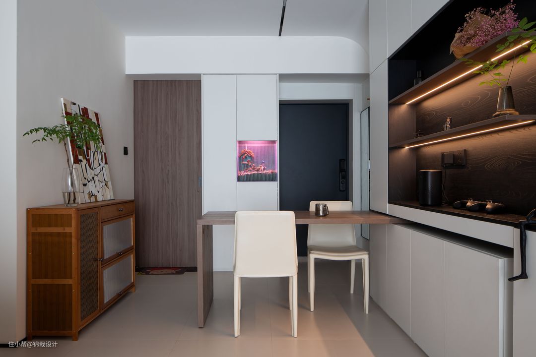 由于业主平时在家做饭的时候比较少,多以外卖为主,家里主要的成员是情侣👫二人,为了最大化的利用空间,将餐桌和柜子整体进行了设计,将餐桌设计成了旋转的形式,平时二人在家靠墙吃饭就可以了,这样空间显大活动也比较方便,家里有客人的时候,将餐桌旋转出来坐,可以满足5-6人同时聚餐。