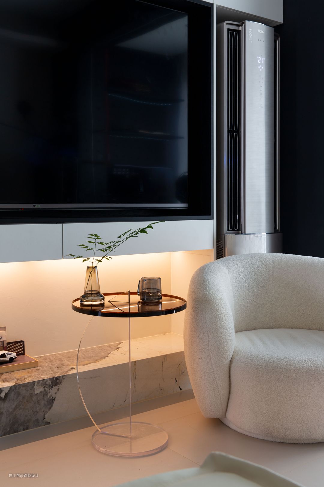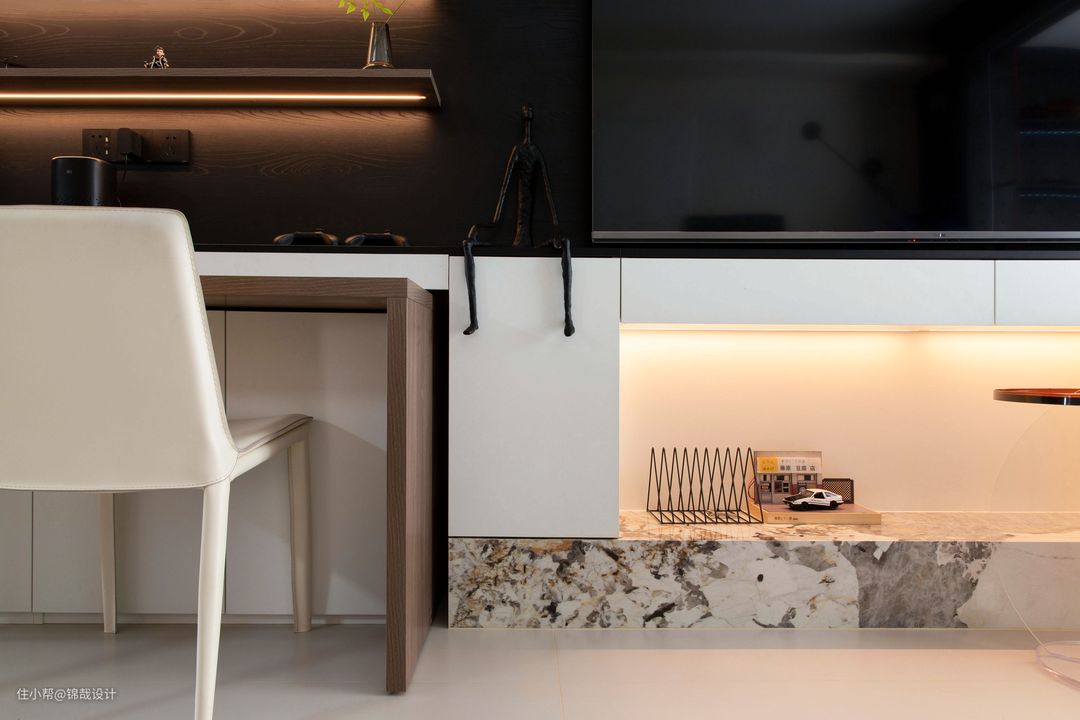 设计亮点:在电视机的下方是二组抽屉,抽屉下面设置了一个壁龛,壁龛的台面采用了潘多拉哑光岩板,尽显空间的低奢质感!