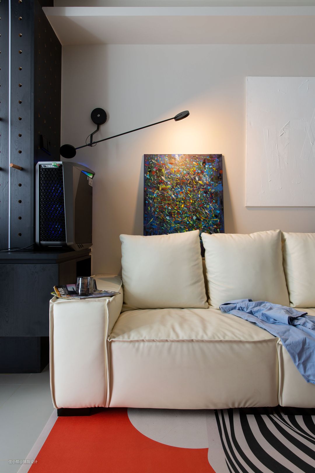 设计亮点:客厅的主位沙发选择了一款意式极简豆腐块沙发,米白的颜色让它和整个空间进行了颜色上的呼应,长条的壁灯可以给空间营造良好的氛围。