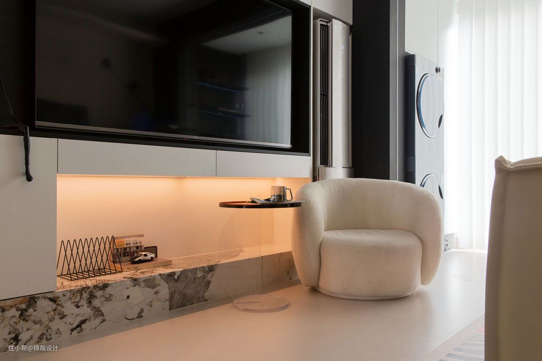 设计亮点:客厅的阳台区域实现了业主的家政功能,洗衣机选择了一款10KG智能洗烘套装,简洁的造型,极简的设计和整个空间融为一体!扫地机器人选择的是一款集扫地机,扫地、拖地、吸尘、自动洗抹布、集尘等功能一体机,扫地机器人的出现,为家里带来了干净的居家环境。