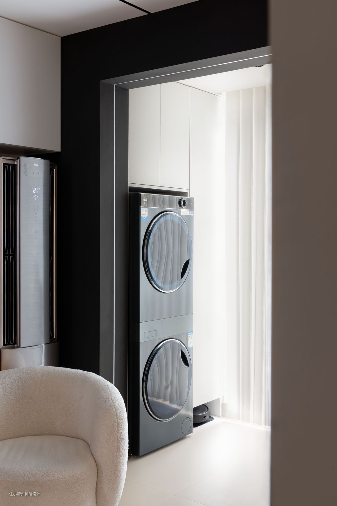 ④:在原有阳台放置多肉的位置增加了一组家政柜,实现了洗衣机烘干机的功能,且在阳台再增加了一个扫地机器人~
