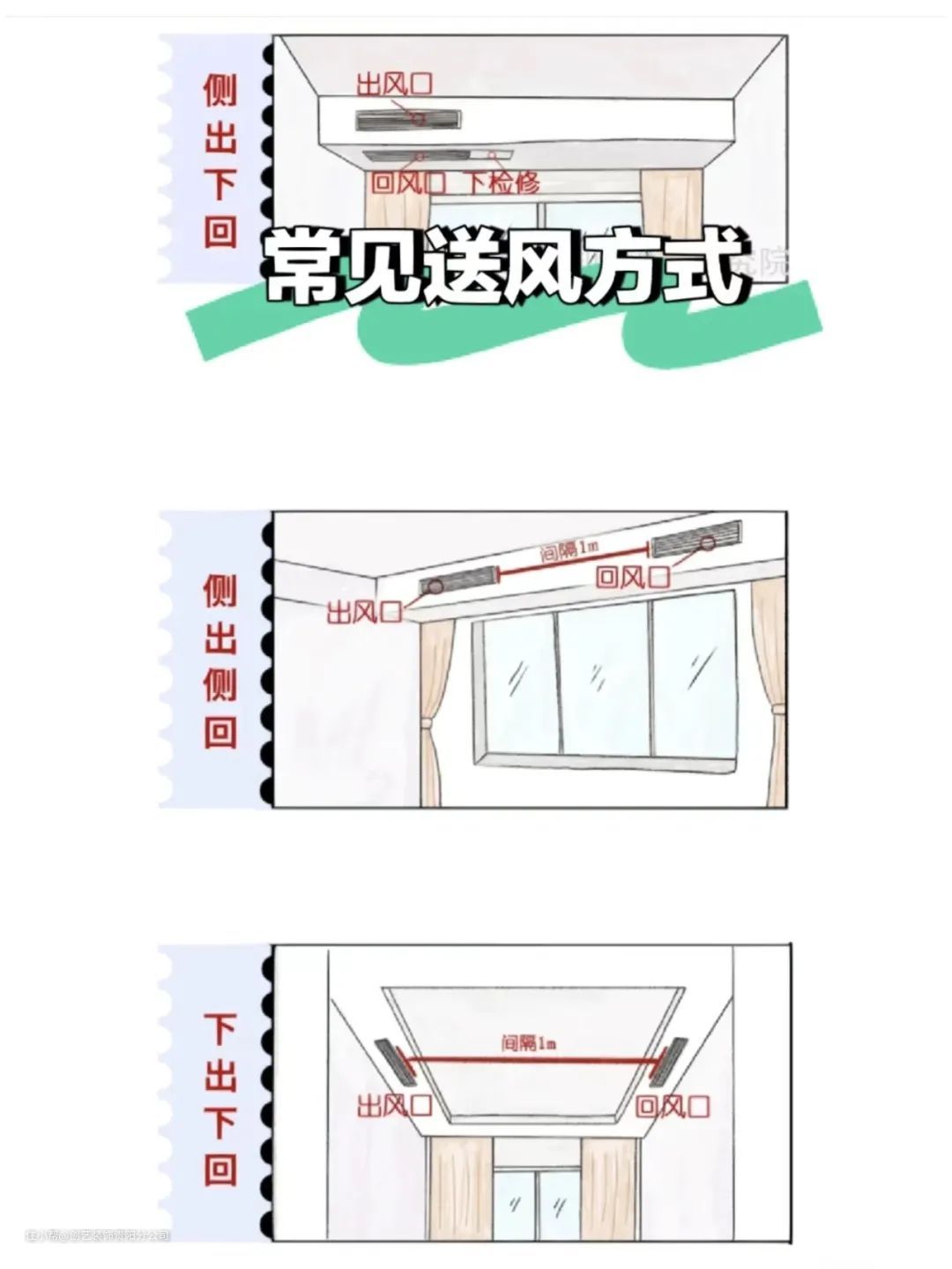 1. 中央空调的风口安装位置:最好是侧出下回。因为出风口不能正对着人待的地方,比如沙发、茶几、床、餐桌等。
