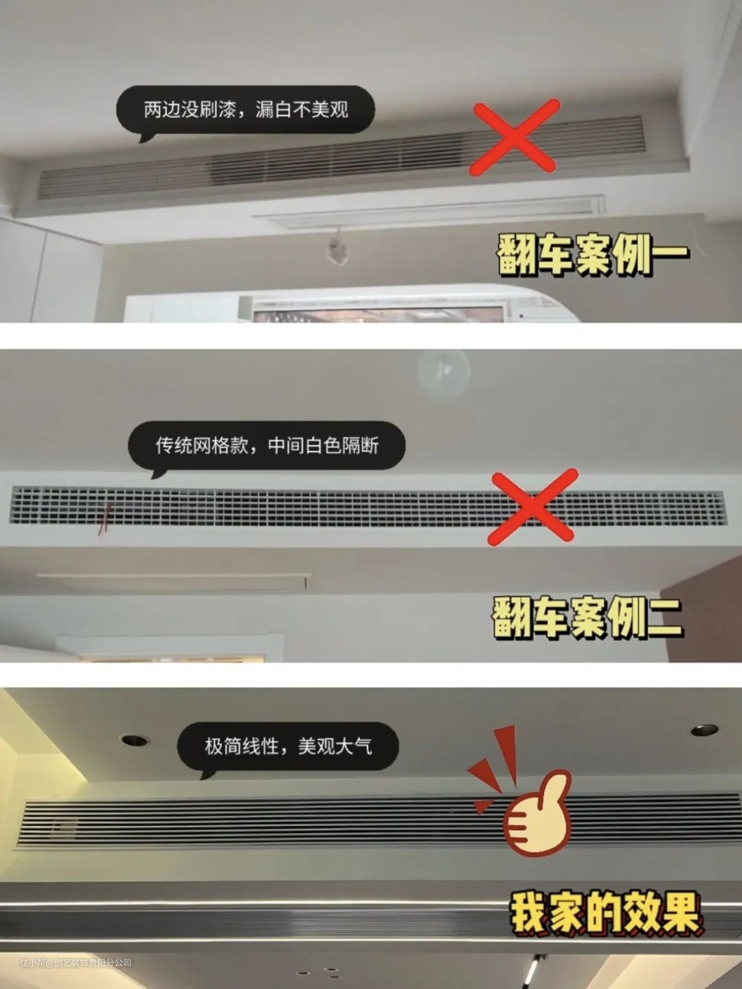 5. 风口加长,肯定就会有一段长度是“假风口”,一定要求油工师傅用黑色油漆把“假风口”这部分给涂黑,这样安装之后才能和真风口颜色一样。否则就会露出里面的结构,真的很丑!