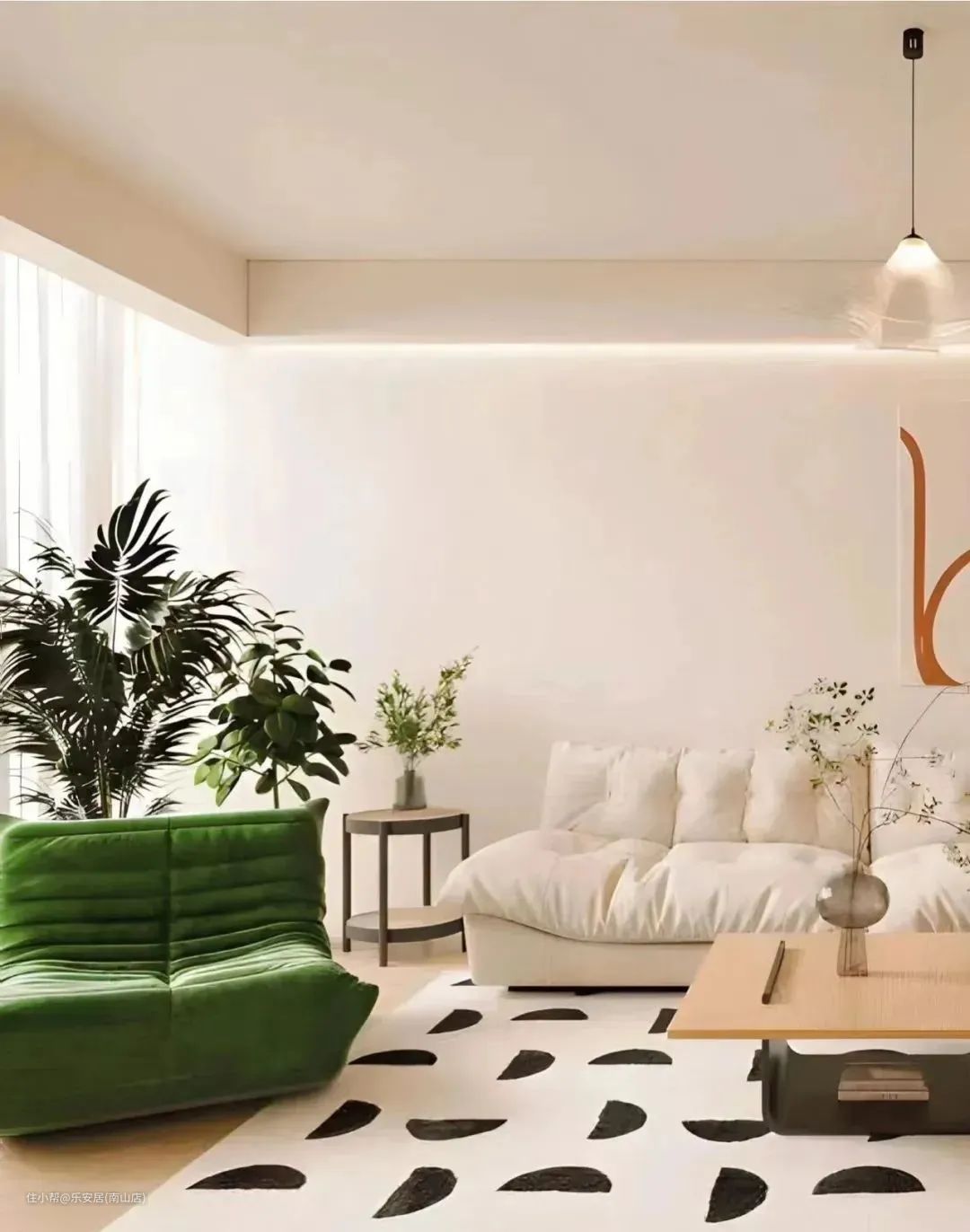 花朵和绿植是轻法式风格的必不可少的元素。可以放置一些花器或悬挂花篮,增加起居室空间的精緻感。