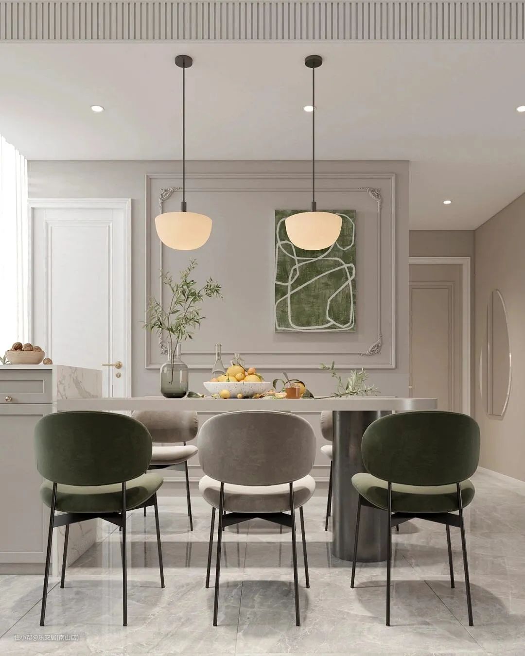 轻法式风格的空间需要柔和的光线,因此在选材上需要选择白底石材、壁纸等装饰,这会使得灯光反射得更好,加强空间感和柔和感。