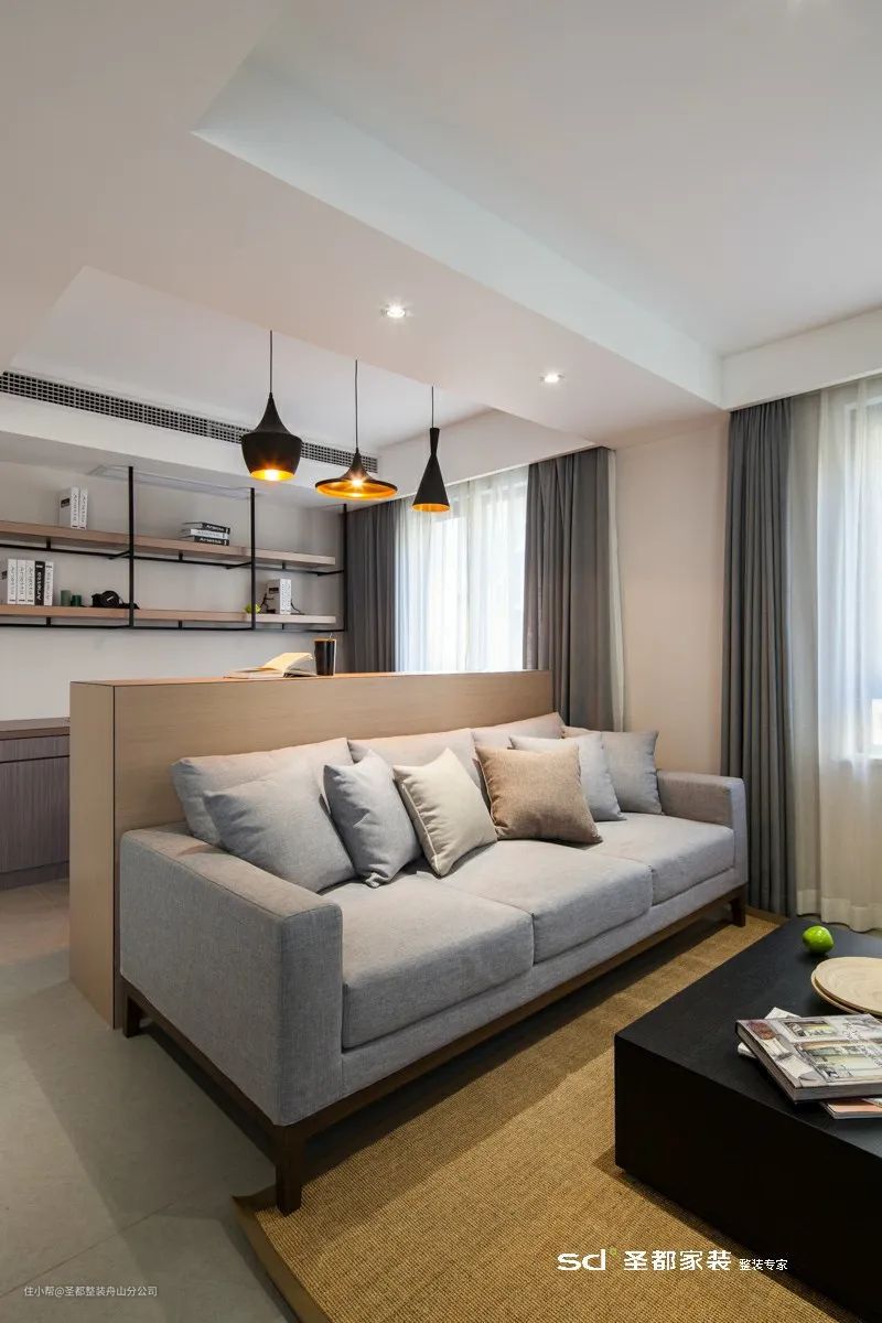 比如,可以以沙发靠背为隔断,在后方安排榻榻米,开辟一片亲子互动区。