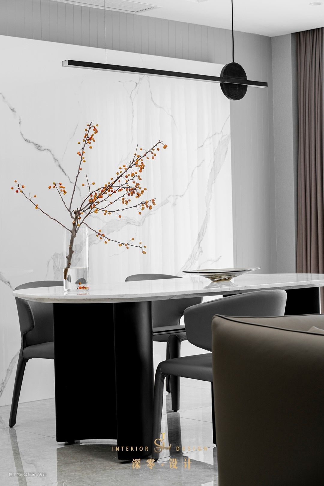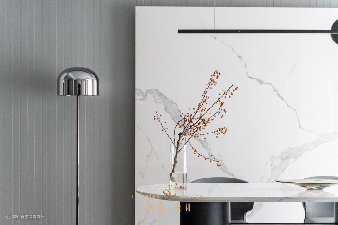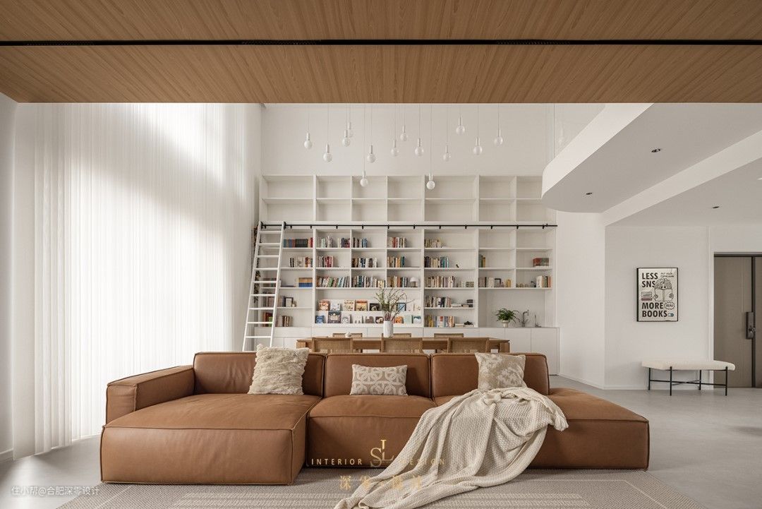 大餐桌不只是为了用餐,日常还能同时满足阅读办公,家里有孩子的,配孩子做做手工,一家人即便在同一桌面上,也能各干各的,其后借着挑高层设大面积书墙,底部是封闭式的,整个有藏有露。