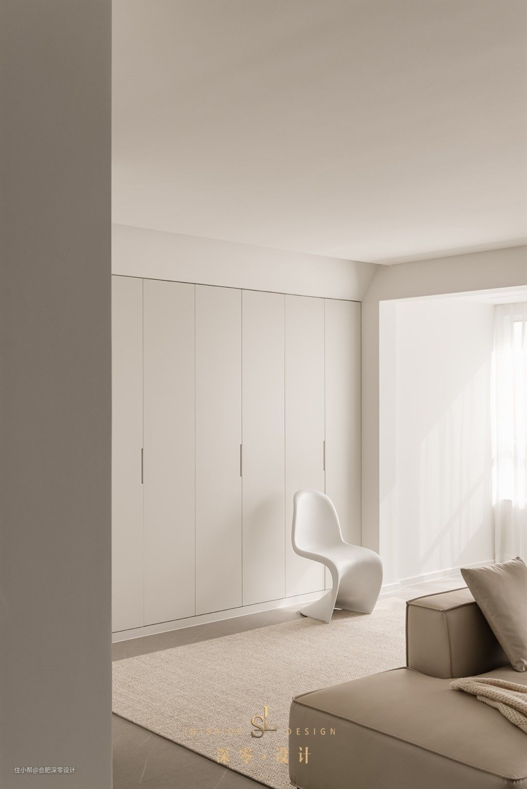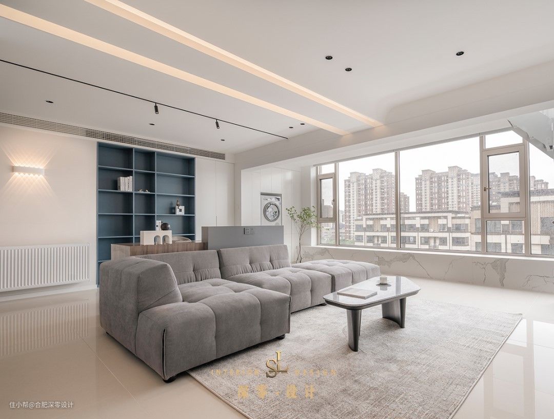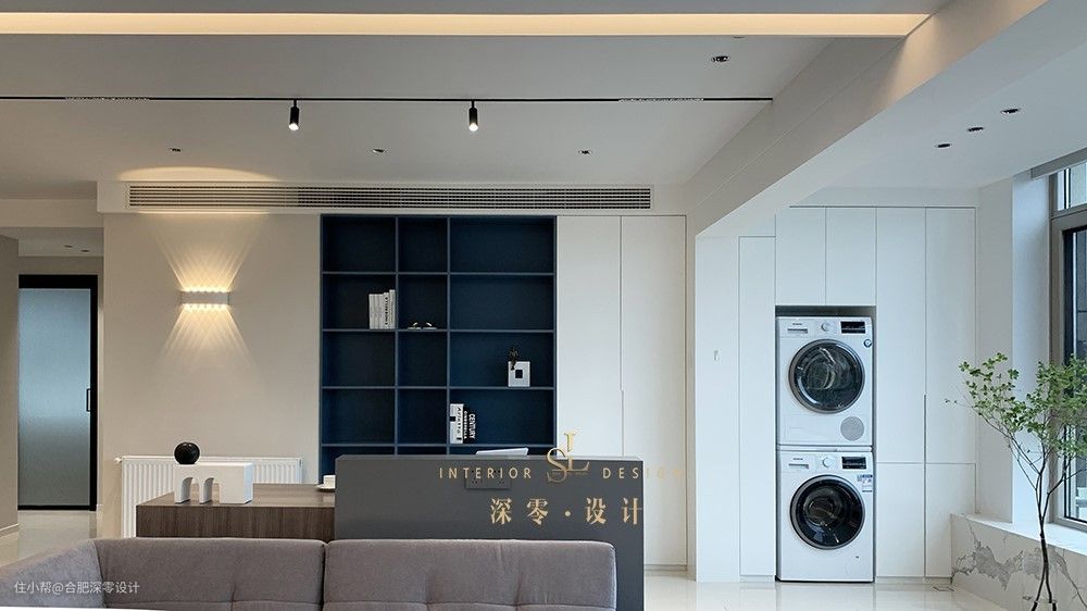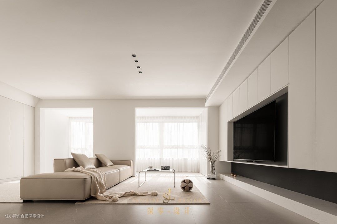 沙发后的面积大小,决定你的功能取舍,像他家只是在沙发的墙面,打上了整排到顶的柜子,搭配无把手设计,整洁又美观。