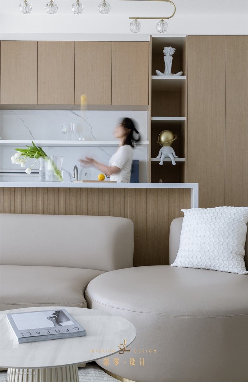 沙发后用岛台做隔断,增加收纳的同时,更在意仪式感的,可以适当留空做小吧台,在这儿用个简餐是没问题的,但其后定制柜要做出对应的调整,而不是专注于收纳上。