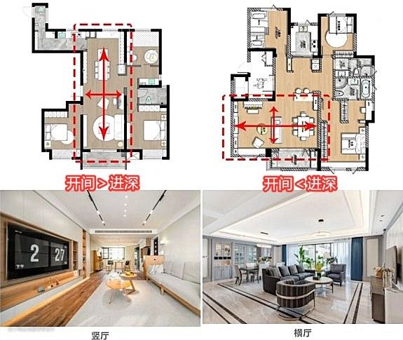 简单解释下,横厅跟竖厅的区别主要看客厅长和宽的大小比,如下所示: