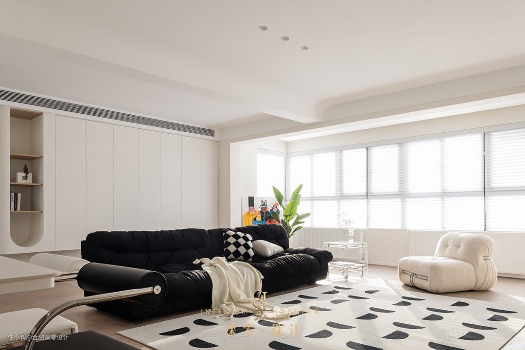 不要觉得这块区域浪费了,尤其是有孩子的家庭,适当留空将沙发后做休闲区,方便孩子在室内玩闹,日常玩好的玩具等也能自主收纳进柜内。