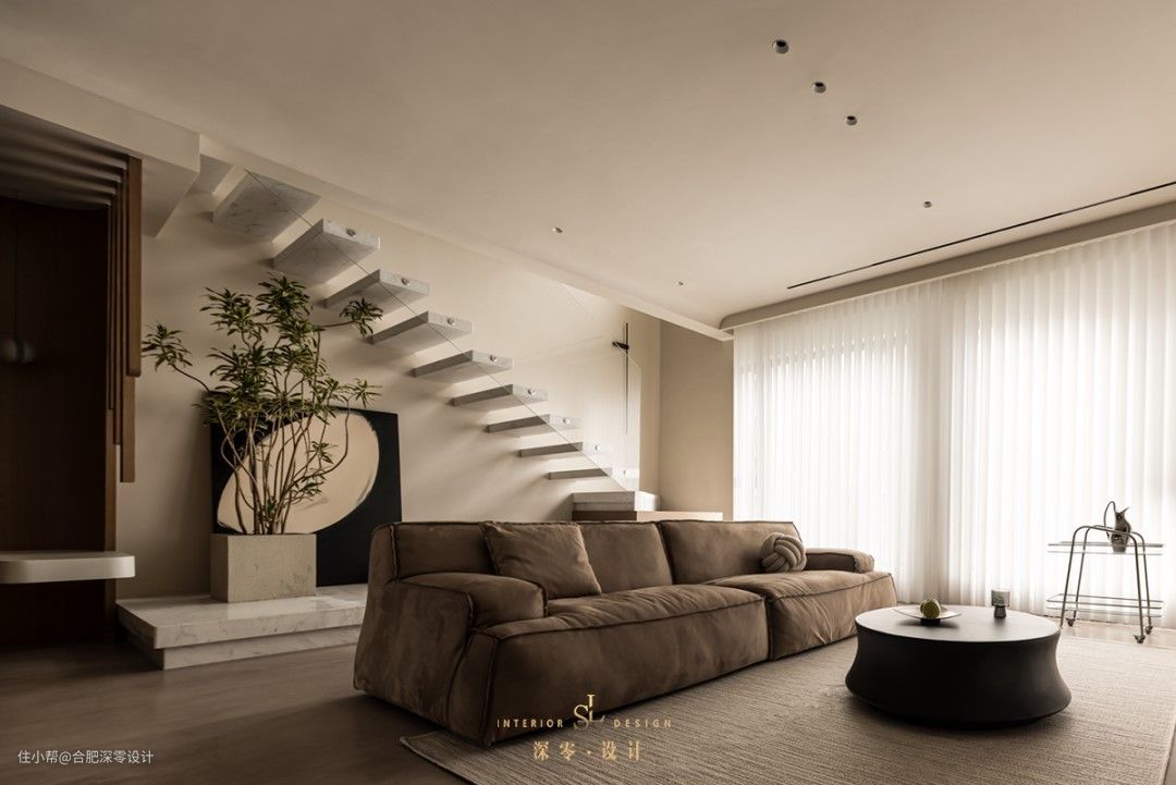 他家楼梯虽说是悬浮的,但实际踏步间距和高度都做了调整,上下楼中视觉上不留空,并不会造成不安感,玻璃扶手做防护,真要介意的选常规楼梯样式就好,踏步底层适当加宽并顺墙延伸做错层,放些摆件做点缀,室内更为轻松自然。