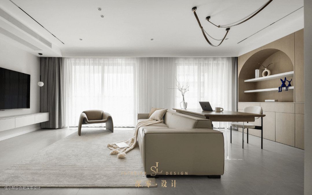 沙发后放一张书桌,不想要买成品的,也可以直接请师傅现场打,只不过要提前预留好插座,方便后续使用,这户人家就是一个例子。